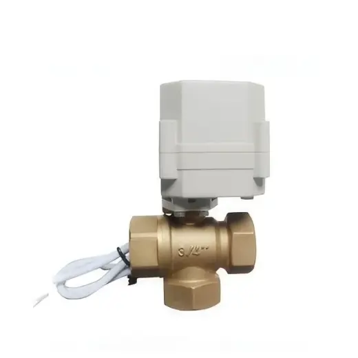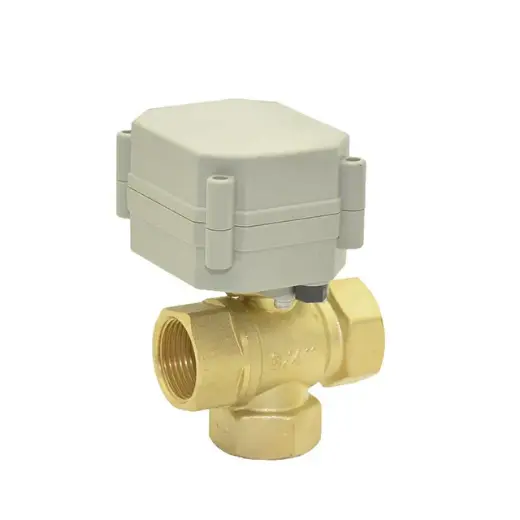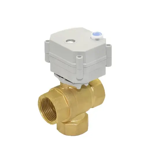 casa Casa / Prodotto / Valvola ad azionamento elettrico / Valvola elettrica in miniatura / Valvola a sfera motorizzata in ottone verticale a 3 vie serie DK60-B-T per il controllo della direzione del flusso